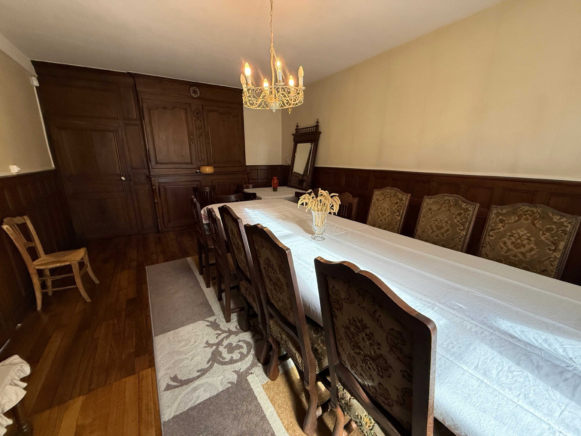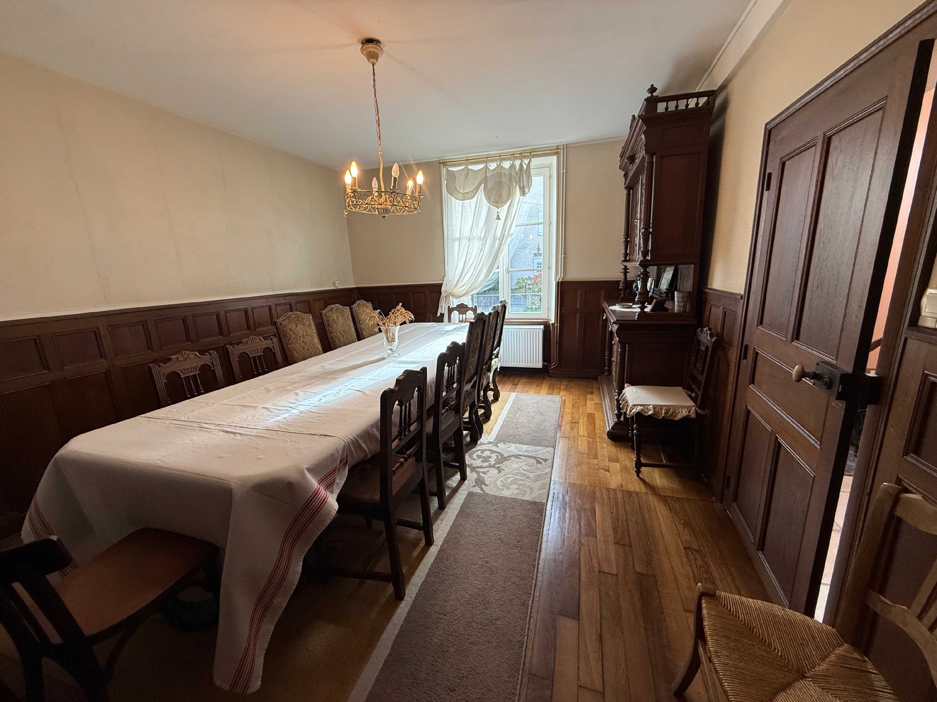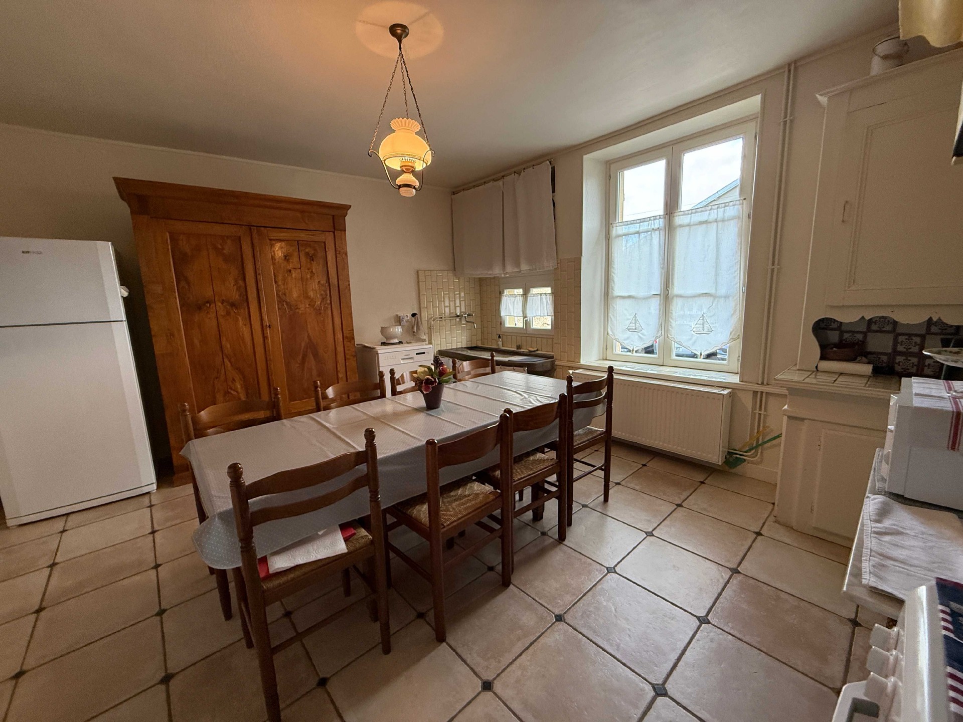 step inside and be immediately enchanted by the spacious entrance hall, where a beautiful tiled floor flows gracefully into the kitchen beyond. every detail has been finished with taste and an eye for quality a theme carried throughout the entire home.to the left of the hall lies a magnificent salon featuring a marble fireplace, fine wooden flooring, and classic doors that whisper echoes of another time. on the right, the large dining room continues the charm with its wooden floor, wall paneling, an old drying cabinet, and original doors.continue through the hallway to the back, then turn right to discover the timelessly authentic kitchen. here, a magnificent open hearth and stone sink create a wonderfully cozy old-french atmosphere where life feels simple and good.on the ground floor, you will also find a utility room with a small decorative fireplace, housing the washing machine, dryer, and oil-fired boiler. the original stone floor adds delightful character to the space.a grand wooden staircase rises from the hall to the upper floor, leading to three bedrooms one with its own marble fireplace and a beautifully styled, vintage-inspired bathroom. there is also a small loft that could easily be transformed into a spacious dressing room.back downstairs, a door from the utility room opens into the enormous barn where horses and cattle once stood. the space now offers ample room for several cars. though the roof is not new, it remains in very good condition. the main house features double glazing and oil-fired central heating.surrounding the home is a large garden with a well. while there is currently no direct access from the main living area, such could easily be created. additional outbuildings to the side and rear, along with a vaulted cellar, complete this exceptional property.this authentic mansion has been lovingly modernized without sacrificing its original charm. move in right away and fall in love all for a surprisingly gentle price.